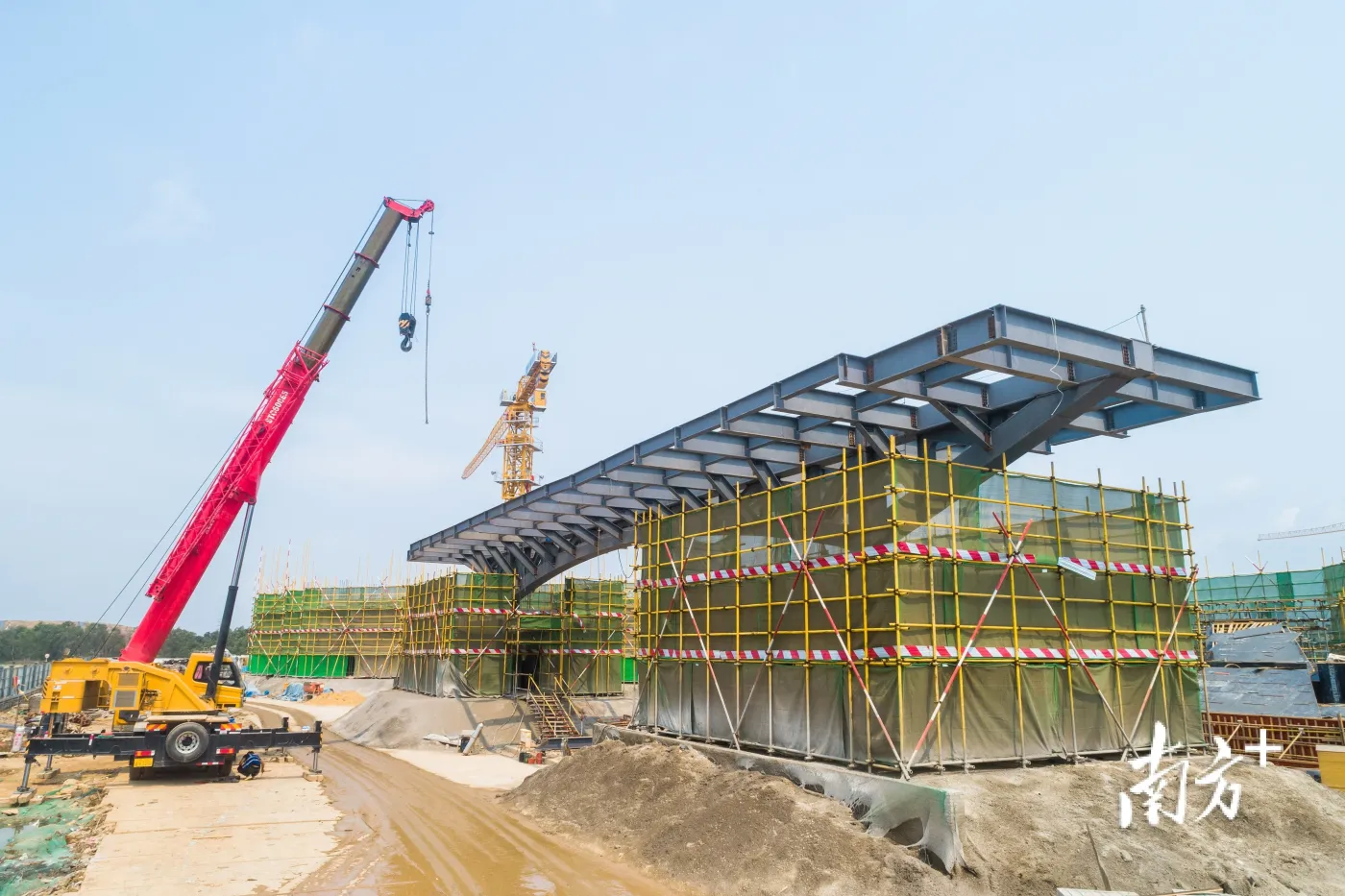 从中海路向西望去,滨海湾外国语学校建设现场塔吊林立,挖掘机、桩机施工轰轰作响,校园各区域的轮廓逐渐显现出来。目光聚焦到校门区域,校门“骨架”雏形初现,对比效果图便能在脑海中联想到校门建成后的模样。