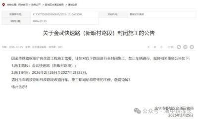 金华婺城区政府公告金武快速路(新畈村路段)将因铁路枢纽扩容工程全封闭施工。封闭时间为2026年2月26日至2027年2月25日,期间禁止车辆通行。过往车辆需按临时导改路线绕行。施工带来的不便敬请谅解。