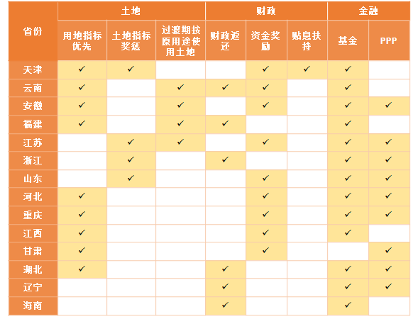 土地方面,一是优先安排用地指标;二是对如期完成的按比例给予奖励,对未达成的加倍扣减;三是利用现有房屋和土地兴办文化创意、科研、健康养老、工业旅游、文创空间、现代服务业、互联网+新业态的,可实行5年的原类型过渡期政策,期满后可按新用途变更。财税上,包括一般3-5年的财政返还、资金奖励(有的按年给,累计三年;有的一次性给予奖励,规模200-500万元不等)和贴息扶持三种。金融方面,支持产业投资发展基金、产业风险投资基金等基金设立,鼓励采取TOT(转让经营权)、BOT(建设—经营—转交)等PPP(政府与社会资本合作)项目融资模式等。