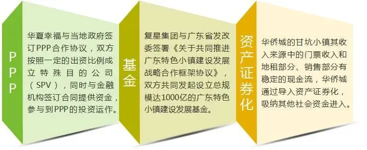 如华夏幸福以“PPP市场化运作”为机制,依托产业集群优势,通过提供全产业链服务,与政府合作创新型特色小镇,2016年下半年至今中标20余个PPP项目,部分将打造为特色小镇;复星集团2017年3月与广东省发改委签署《关于共同推进广东特色小镇建设发展战略合作框架协议》,双方共同发起设立总规模达1000亿的广东特色小镇建设发展基金,投资于基础设施及优质企业培育;华侨城深圳甘坑客家文化特色小镇则是通过融资模式上便是通过地租和门票收入导入证券化融资,吸纳社会资金进入。