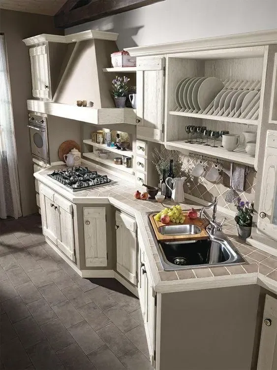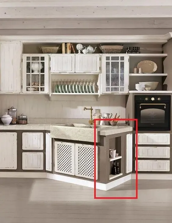 这样一来,水槽区域就会多出一个面,拿来做个柜子或者壁龛都是个不错的决定,也不用担心旁边的烤箱、冰箱等电器不够放,在家里的其他地方去找位子了。