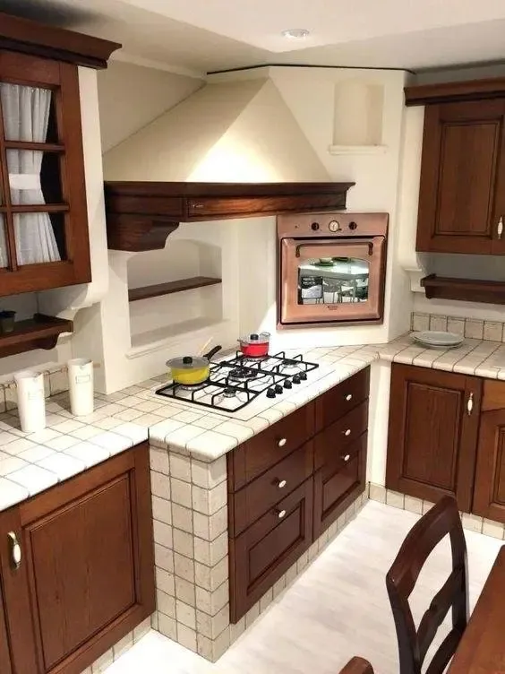 除了这样斜着去找空间,他们也会因为一些要用到灶台前的空间,而去更改台面的宽度,要是放在我们家,估计都不能忍受这样一处宽一处窄的,指不准还要磕碰到边角,影响来回走动。