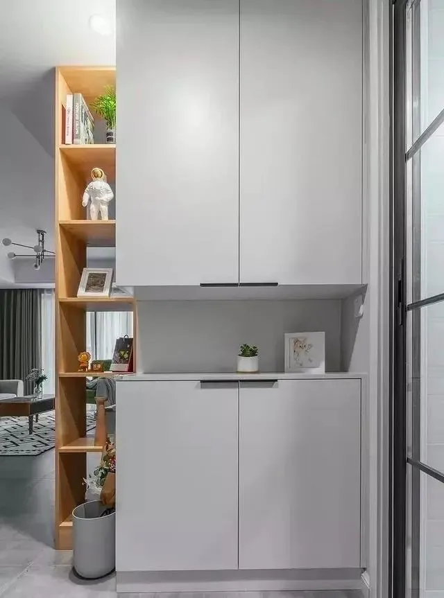 自己造个玄关区域,比如在入户区域做个隔断,带有鞋柜功能。隔断的风格要和家里的装修风格融为一体。