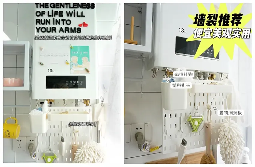 所以还是直接裸露在外,想遮丑的话,用一个洞洞板就能将底部的管道线路隐藏起来,表面还能当成物品挂放区,一举两得。