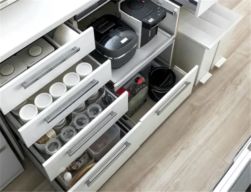 不过,不建议大家做太多拉篮或抽屉,毕竟成本高(土豪除外),学会利用已有的柜内空间,照样能让小厨房储物量倍增。