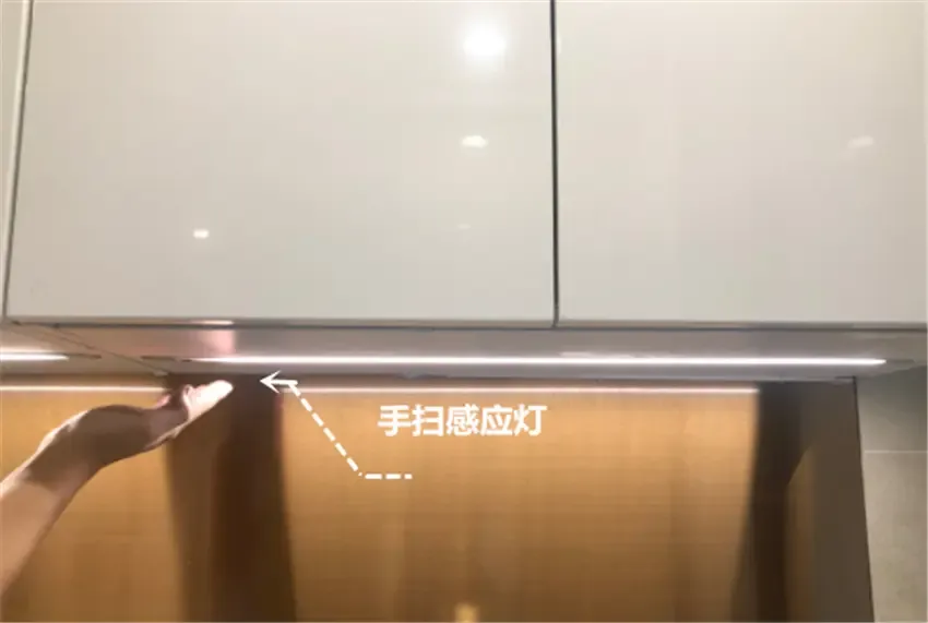橱柜底部记得装照明设备,弥补做饭切菜区域光线不足的问题。可以直接嵌入灯带,也可安装手扫感应灯,让做饭更舒心。