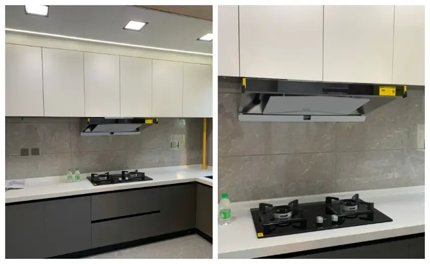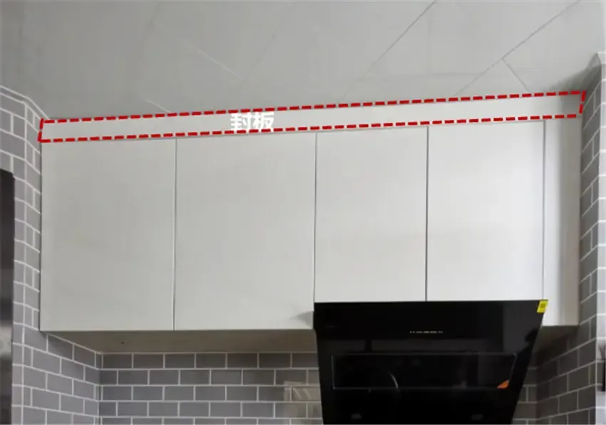 吊顶和吊柜之间不要留缝隙,可在吊顶和吊柜间加一块封板,让整体空间统一,减少卫生死角。