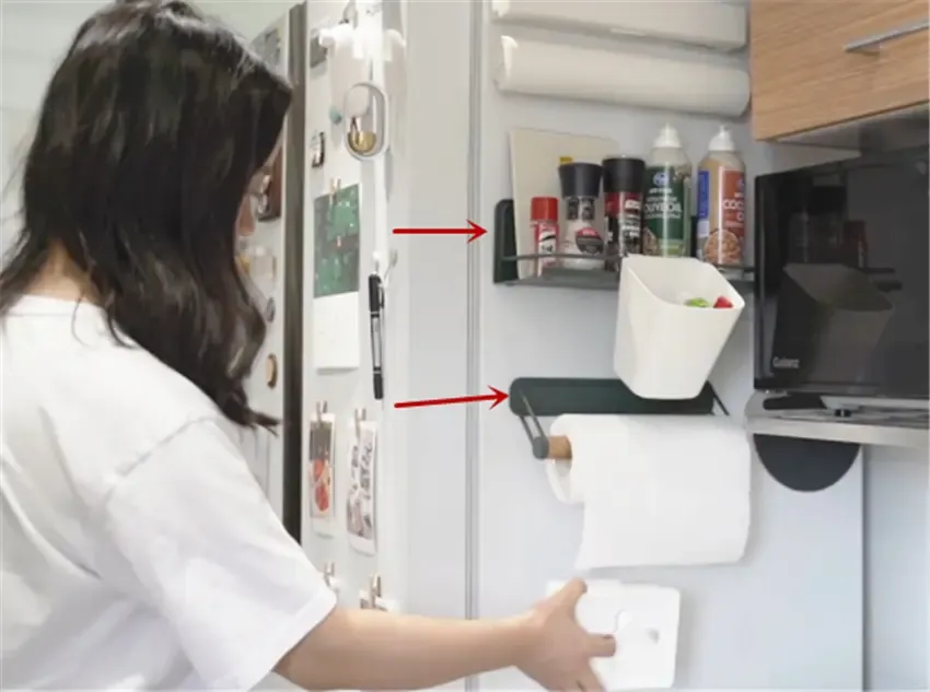 2)磁吸收纳,让小物件都吸附上墙或者冰箱一侧,不占台面空间,保持整洁干净;