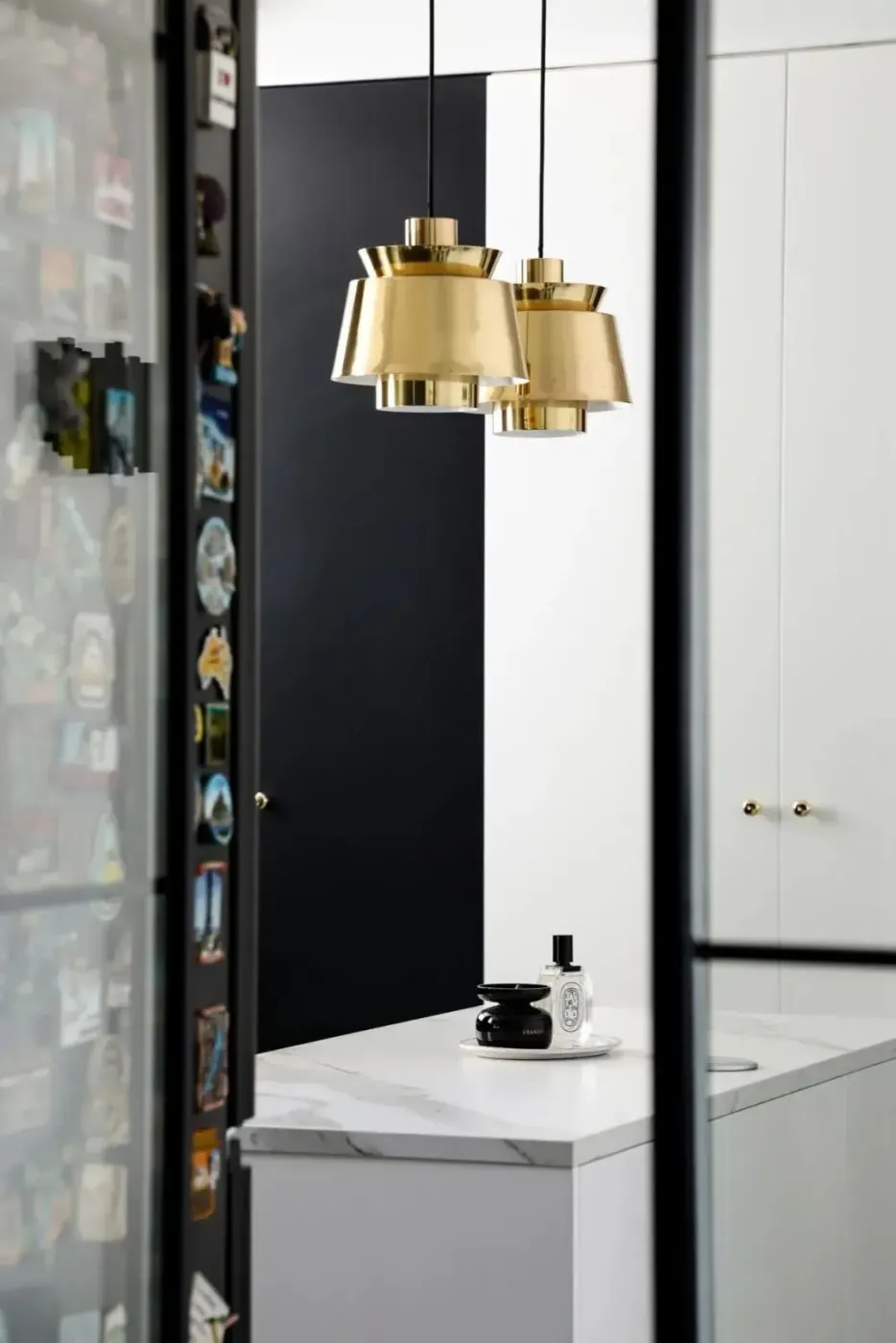 原本狭小的空间,改成了明亮贯通的开放式厨房。充满趣味的拱形穿衣镜,与黑框玻璃门的独特造型,让进门视线得到缓冲。