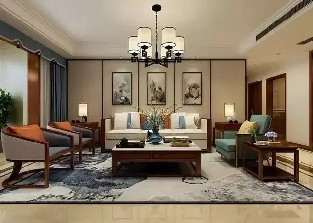 背景墙像是一幅灵动的水墨画呈现在那里,离你时远时近,地面铺设相同色彩地毯,相互呼应。