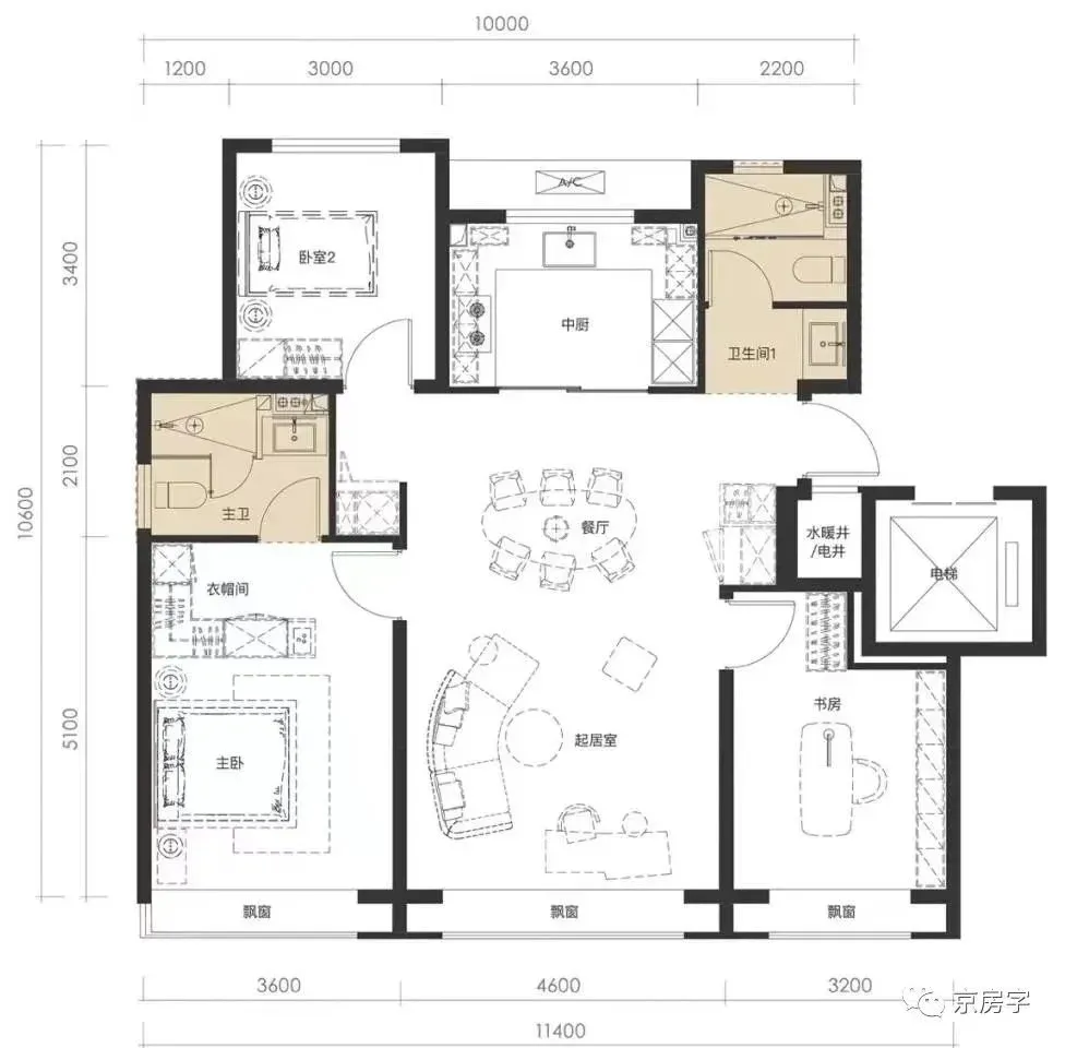 132的大三居南向三面宽,客厅和两个房间都在南侧,南向面宽加在一起达到了11.4米,而且都带飘窗,客厅宽度达到了4.6米,这个一般在140平米以上的户型才会有。两个卫生间都是明卫。