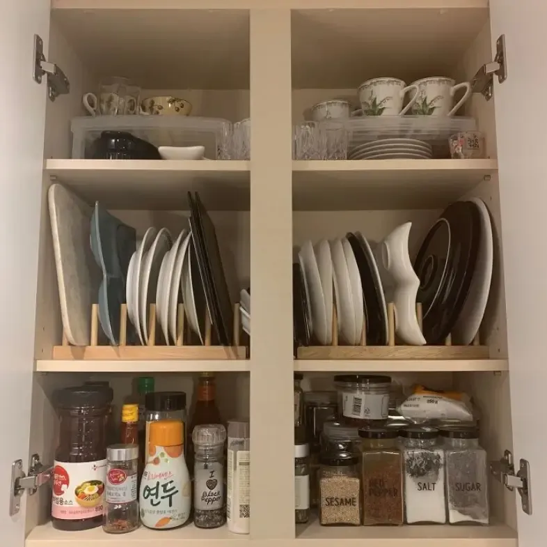 简单的隔层,却有不同的放置方式。通过这个木架,从原本的叠放变成了竖放,这样改变的好处是,更适合不同尺寸餐具的放置,以及拿取时能更加方便。