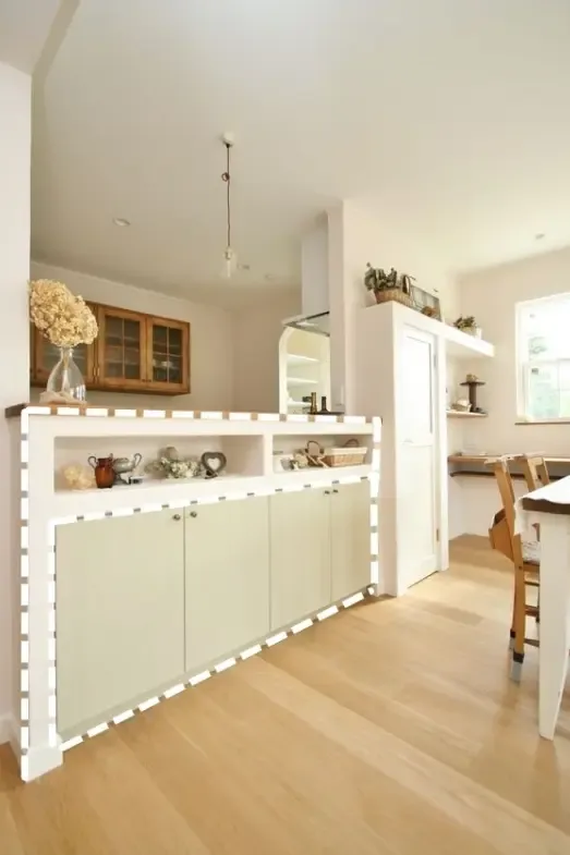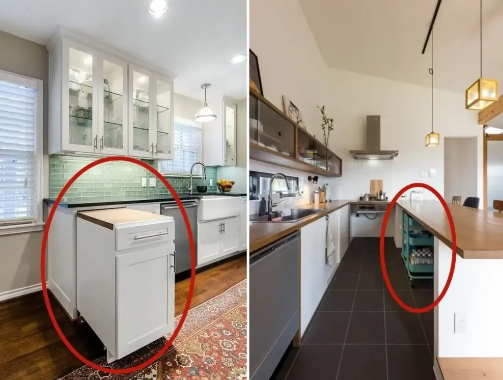 卫生间的壁龛式收纳,也是可以用于厨房当中的。靠外侧的橱柜台面可以抬高20cm,做收纳。解决瓶瓶罐罐、厨房清洁小工具的收纳。而且抬高的20cm可以形成遮挡,开放式/半开放忘记收拾,杂乱“场面”不会被一目了然,舒适度更高。
