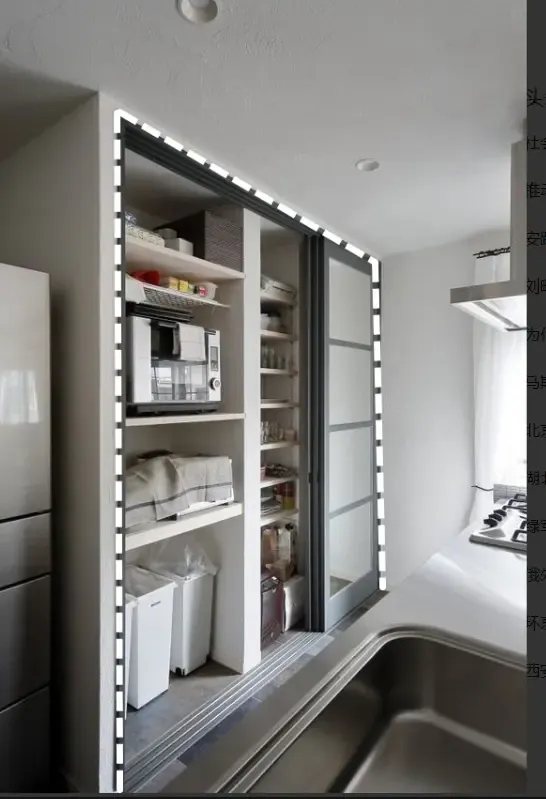 厨房空间相对比较大的,除了基本的吊柜+地柜收纳之外,建议可以在非承重墙面,再做一整面墙的收纳,内部做可调整隔层,然后再装上推拉门,收纳一幕了解,也能减少油烟的影响。推拉门一关,整个厨房清爽整洁,杂乱藏得住。