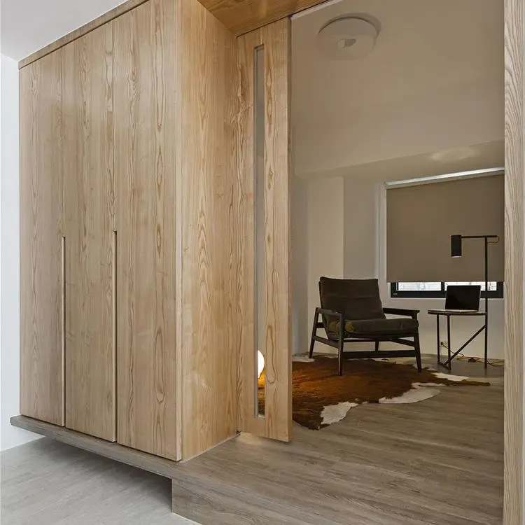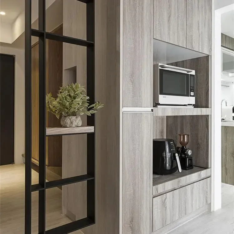 开放式的小厨房,使得室内显得非常敞亮大气,能够让人感觉非常轻松舒适,餐厅旁边的墙壁采用打柜的方式,周围采用浅色的实木扣板装饰,里面能够摆放一些厨房的电器,既美观又能起到收纳储物的能力。