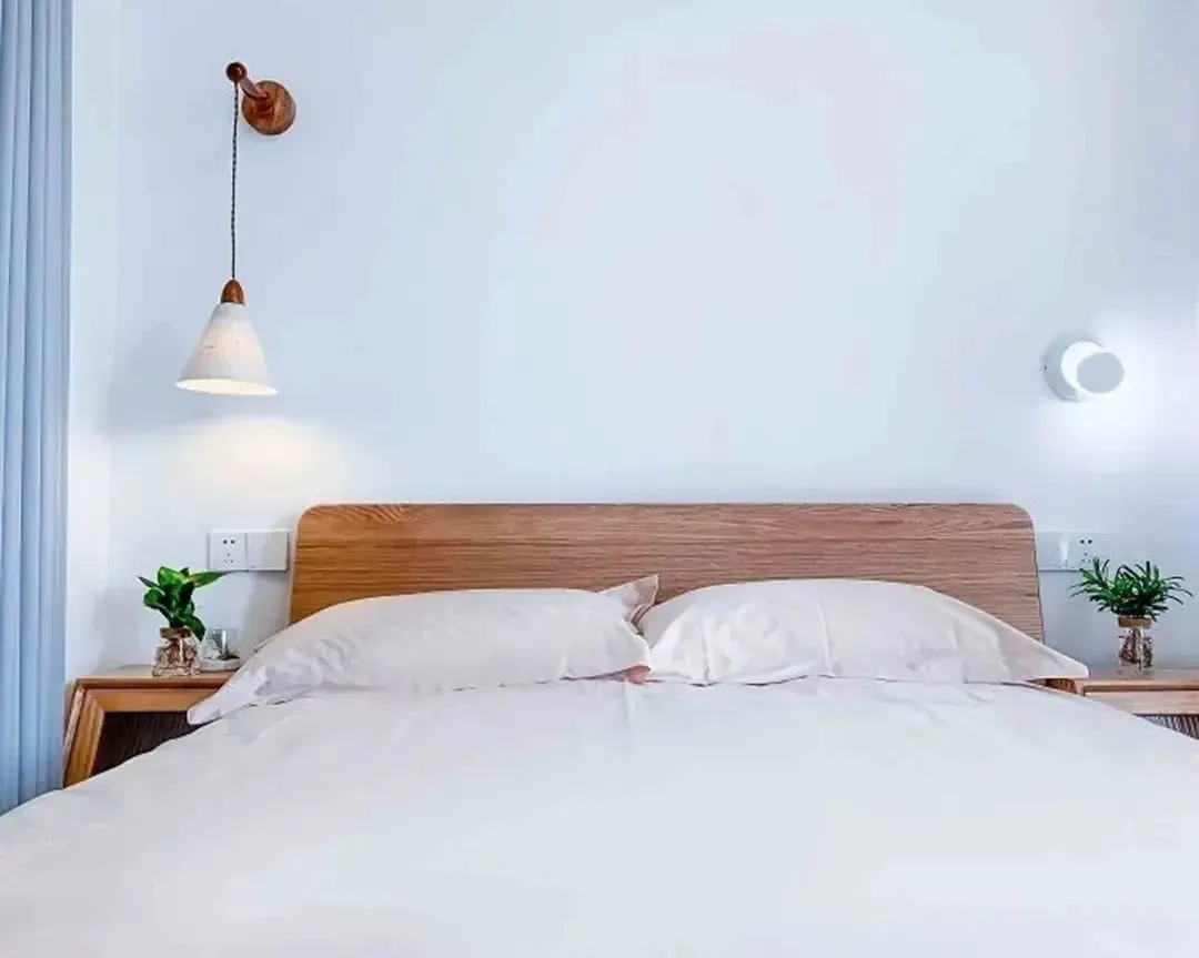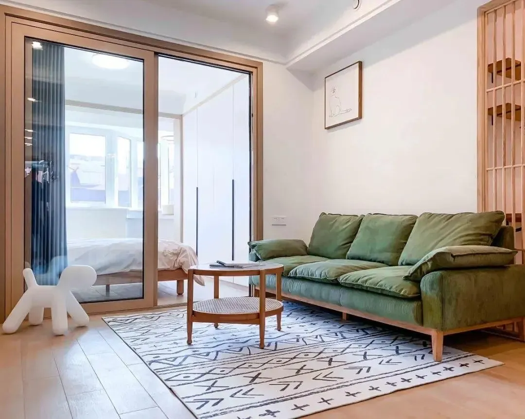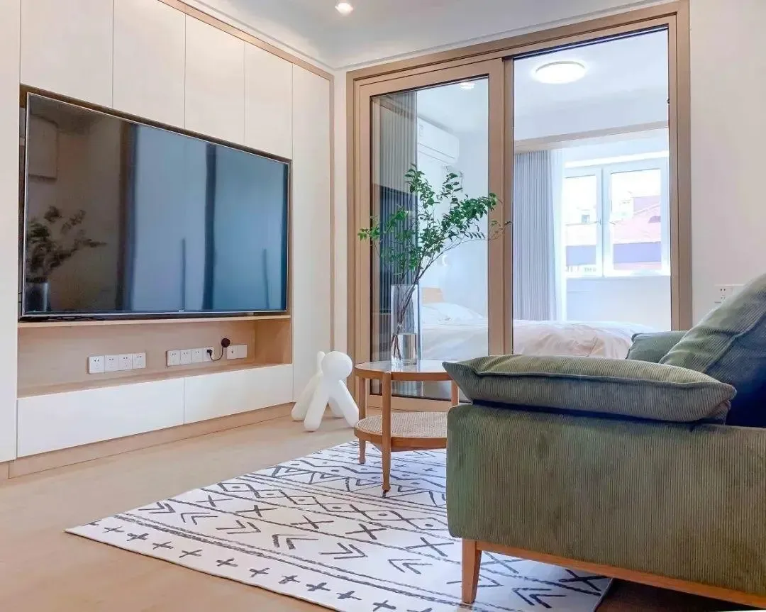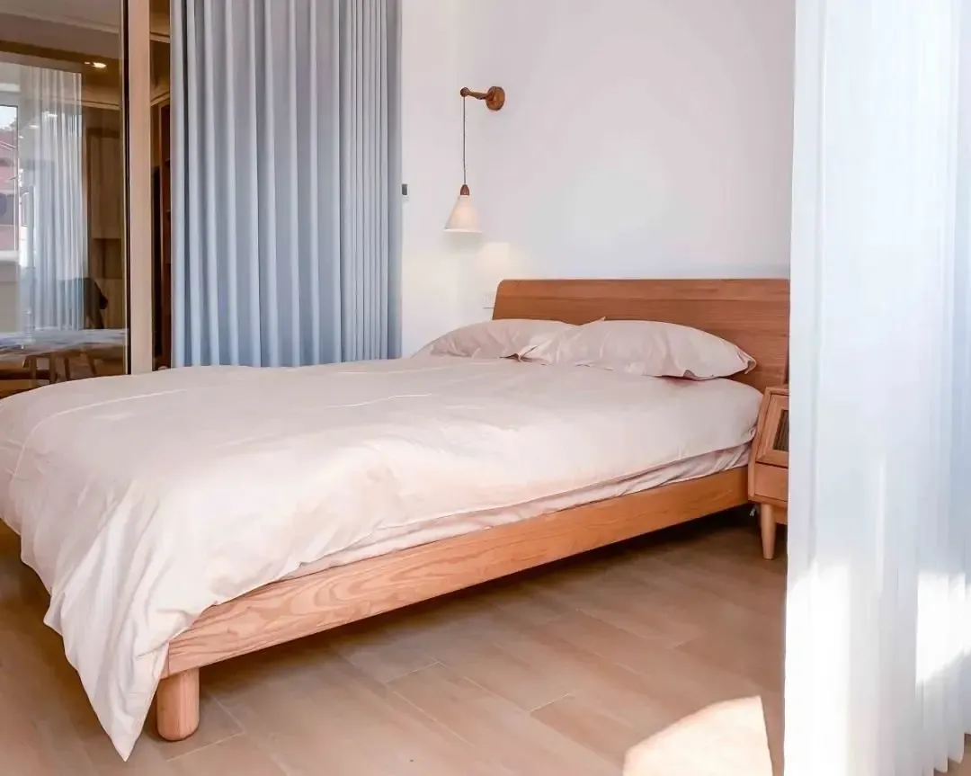 客厅与主卧室互通,让阳光洒入,明亮的光线减少了室内的压迫感。统一的原木色调与白色进行搭配,清爽简洁。