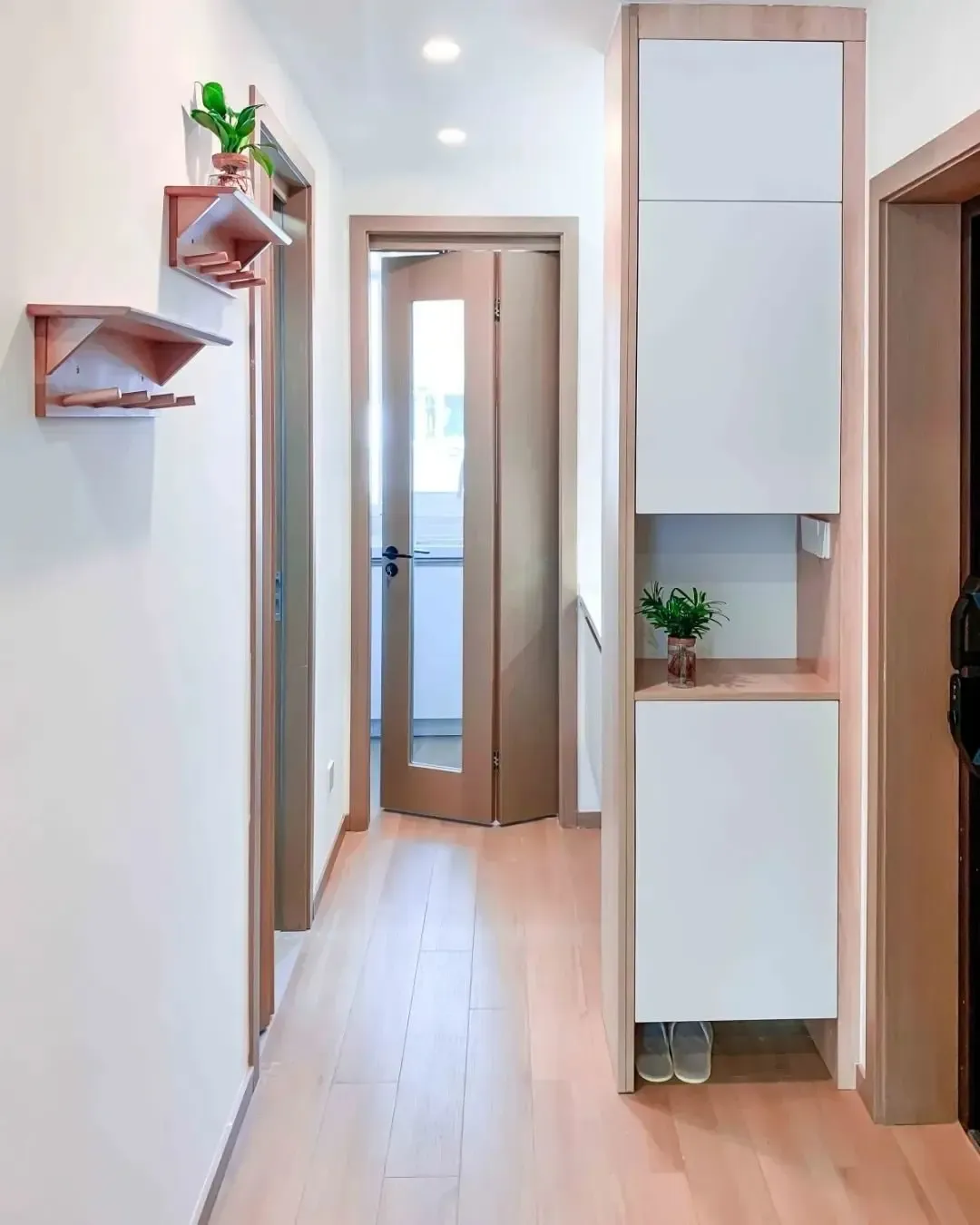 新增的玄关空间增加了收纳规划,顶天立地的高柜设计,可以满足房主平时的所有鞋子,中间的镂空部分可以放置进出门随手的小物收纳。