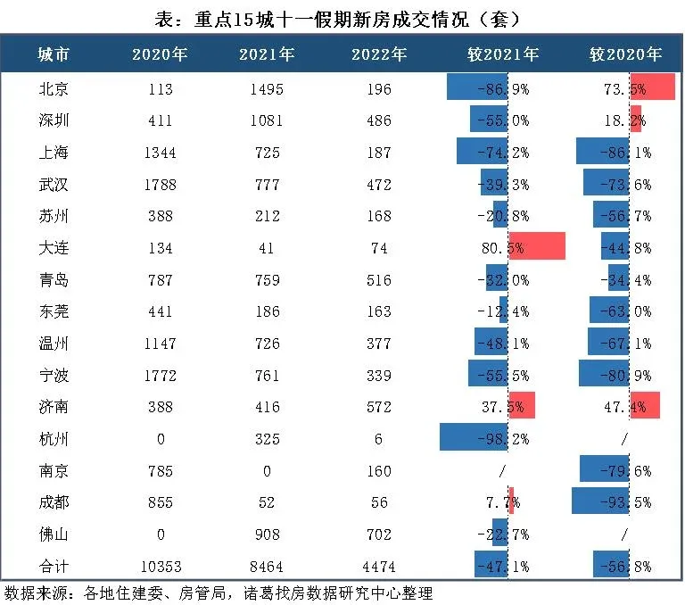 根据诸葛找房数据,长假期间,重点15城新房成交4474套,较去年十一假期下降47.1%,成交仍显乏力,楼市继续探底。(注:重点15城包括:北京、深圳、上海、武汉、苏州、大连、青岛、东莞、温州、宁波、济南、杭州、南京、成都、佛山, 时间为10月1日到7日,以上数据均为网签数据,数据仅供参考)