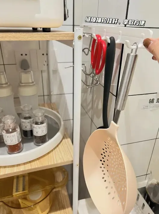 搁架放好后,还有空隙,一定不能浪费。装一个拉杆,上面可以挂漏勺和剪刀,随取随用。