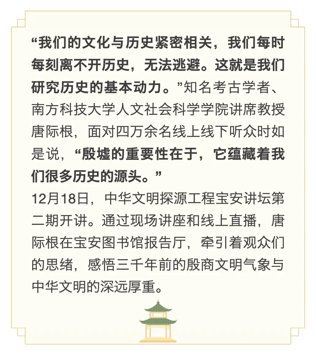 在互动环节中,有观众提问,曾在殷墟博物馆见到赤峰红山文化的玉猪龙,但红山文化比商朝早两千年,应如何解释?唐际根回答,殷墟妇好墓750多件玉器里,有约三分之一为收藏品。“那个时候的人,照样喜欢古物,喜欢历史的感觉。”他说,商朝女将军妇好也注重知识积累,“如果没有过往的沉淀,我们不会有明天。”