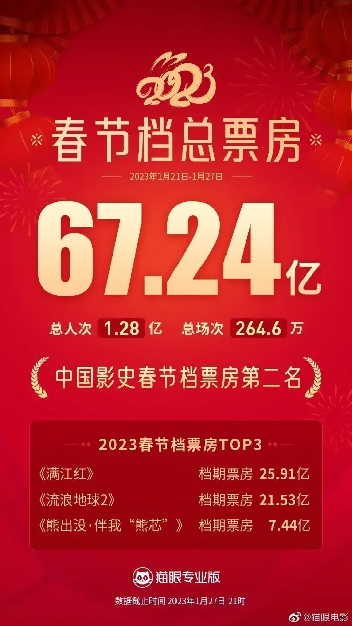 截至1月27日21时,2023年春节档期总票房67.24亿,位列中国影史春节档票房榜第二位。总人次1.28亿,总场次264.6万,平均票价52.4元。共2部电影票房破20亿。