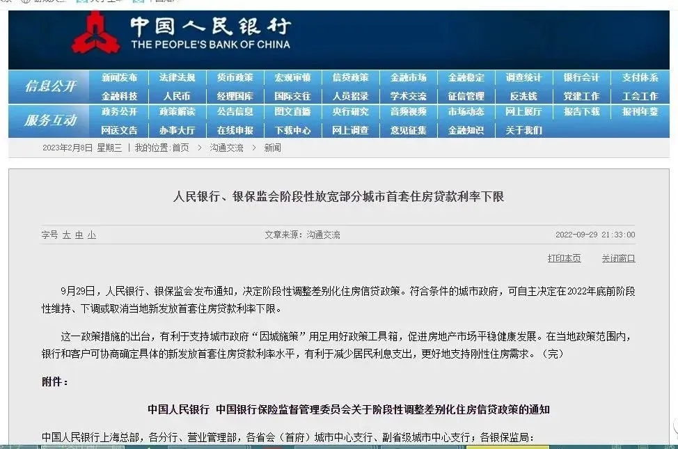 中国人民银行上海总部,各分行、营业管理部,各省会(首府)城市中心支行、副省级城市中心支行;各银保监局: 为坚持房子是用来住的、不是用来炒的定位,全面落实房地产长效机制,因城施策用足用好政策工具箱,更好支持刚性住房需求,促进房地产市场平稳健康发展,按照国务院有关部署,现就阶段性调整差别化住房信贷政策有关事项通知如下: 一、对于2022年6-8月份新建商品住宅销售价格环比、同比均连续下降的城市,在2022年底前,阶段性放宽首套住房商业性个人住房贷款利率下限。二套住房商业性个人住房贷款利率政策下限按现行规定执行。 二、按照“因城施策”原则,符合上述条件的城市政府可根据当地房地产市场形势变化及调控要求,自主决定阶段性维持、下调或取消当地首套住房商业性个人住房贷款利率下限,人民银行、银保监会派出机构指导省级市场利率定价自律机制配合实施。(中国人民银行网站2022年9月29日)