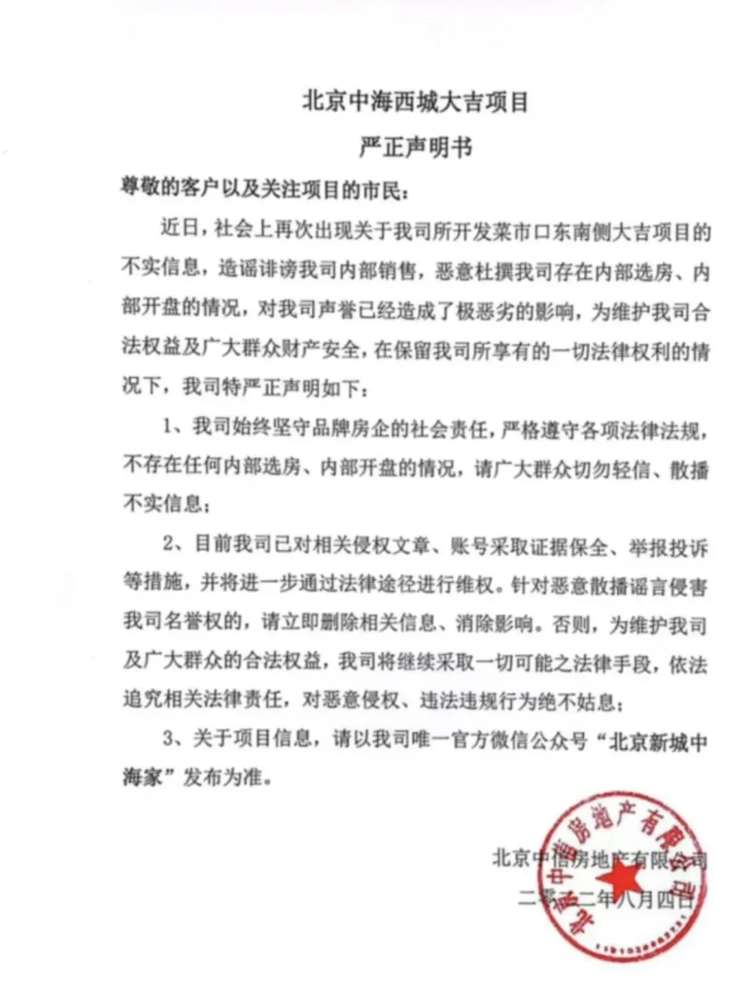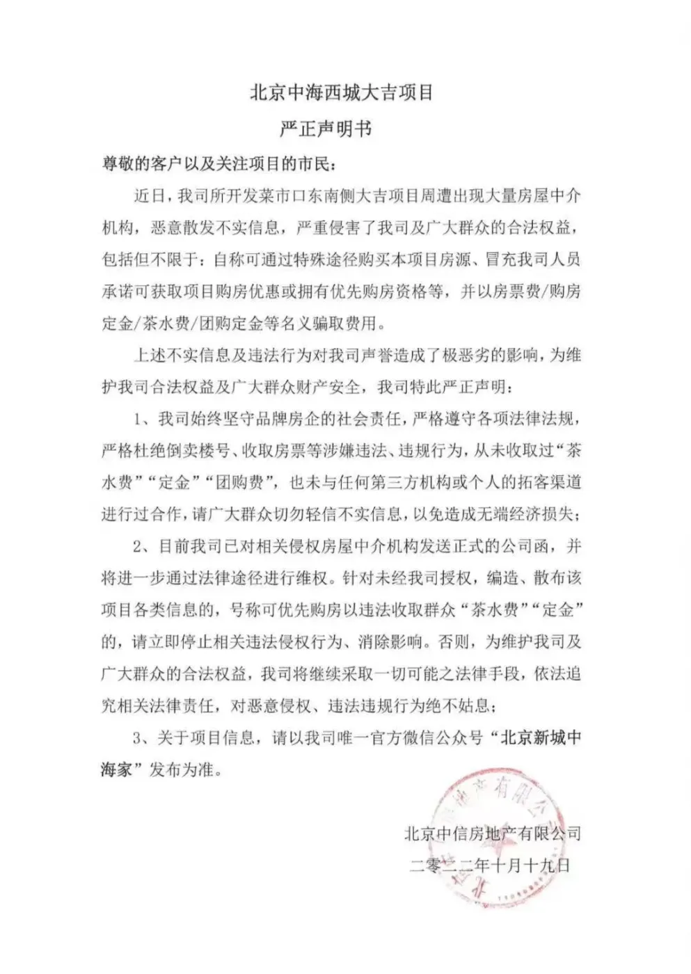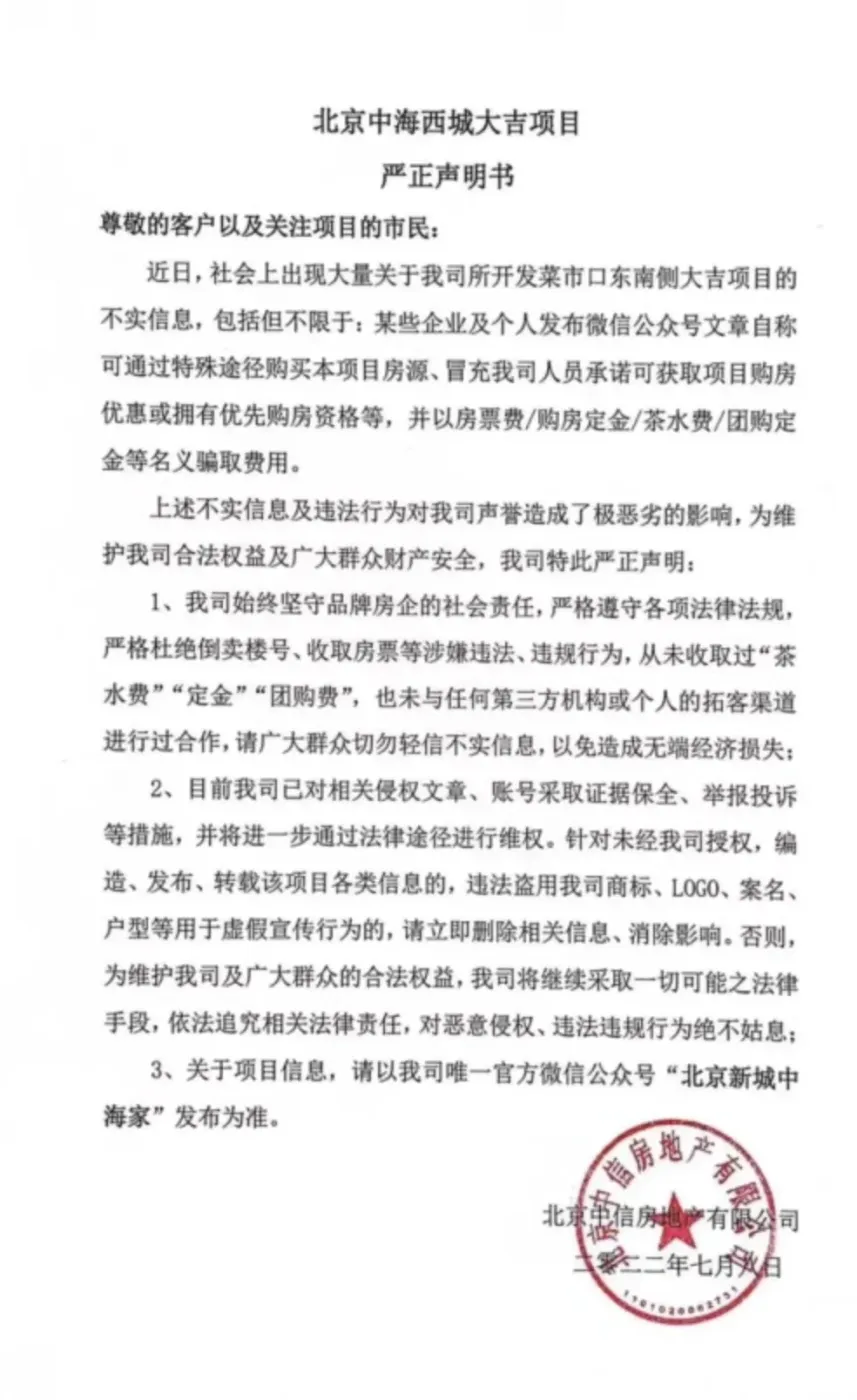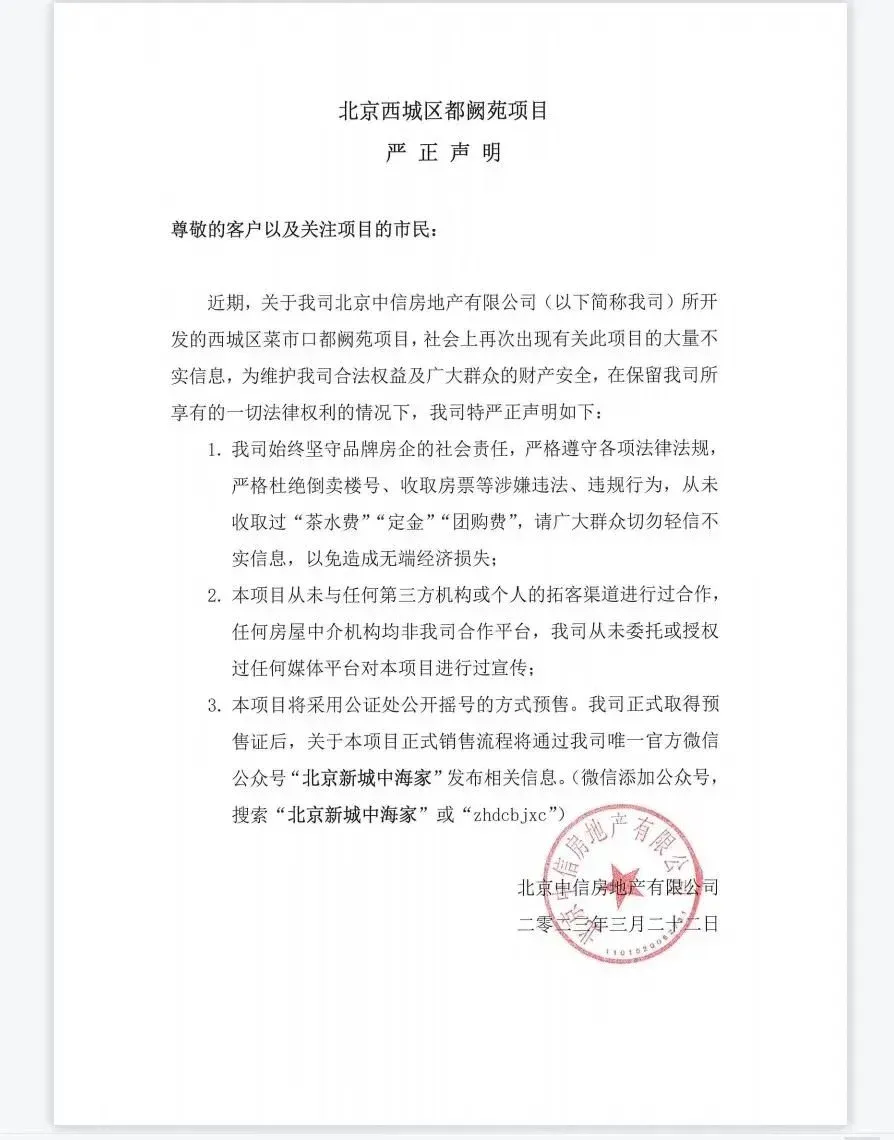就在昨天(2月22日)都阙苑开发商北京中信房地产有限公司(简称“中信房地产”)再次,发布了“北京西城区都阙苑项目严正声明”,表示其从未收取过“茶水费”“定金”“团购费”,请广大群众切勿轻信不实信息。