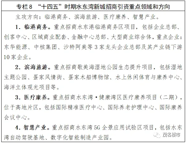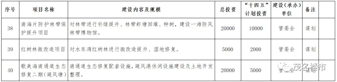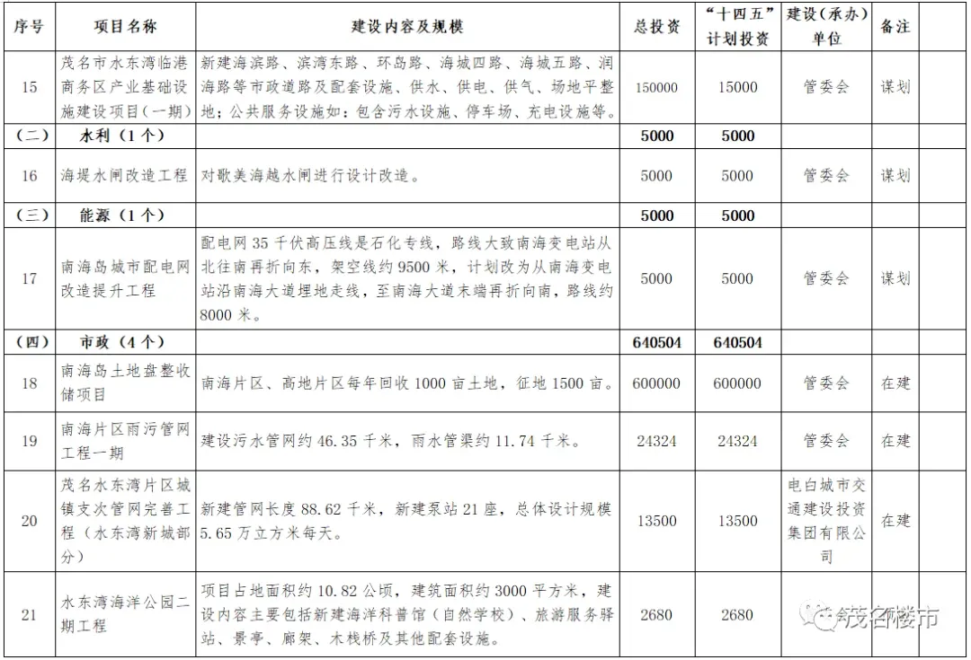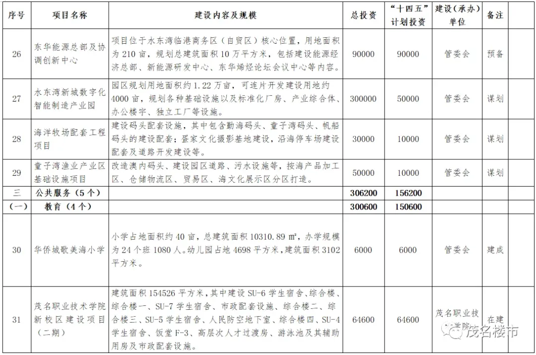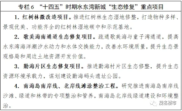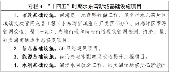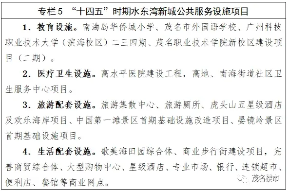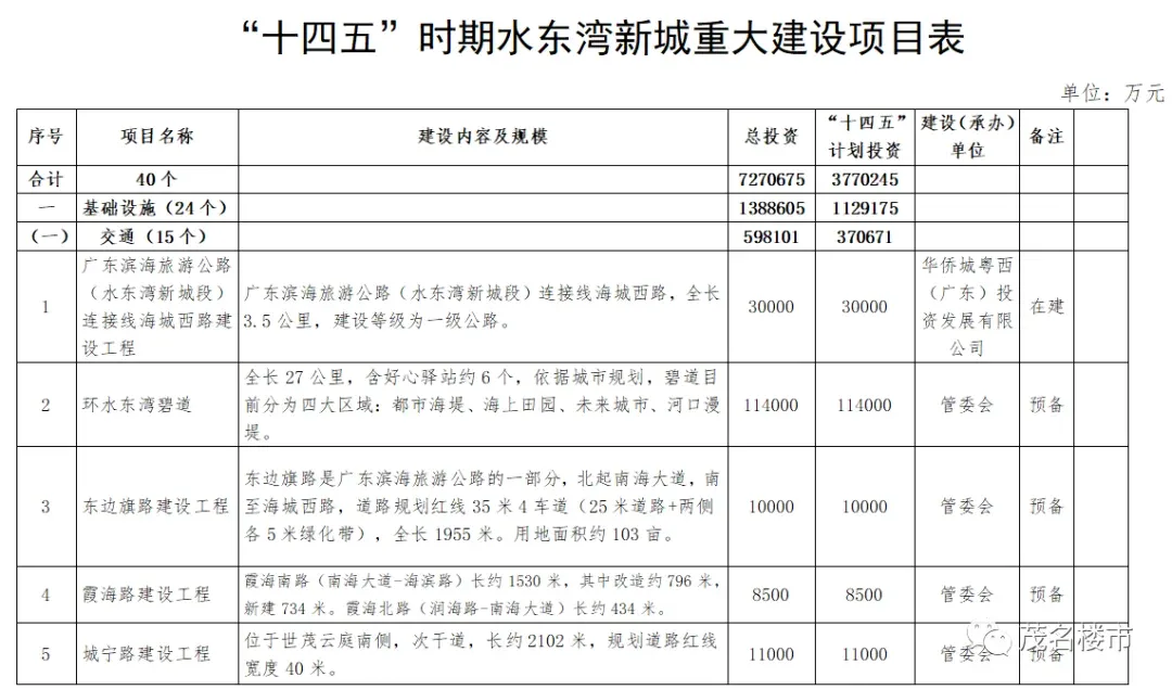 此外,《规划》里重点提及到“十四五”时期水东湾新城40个重大建设项目,包括基础设施(24个)中的交通15个、水利1个、能源1个、市政4个、乡村建设3个;产业项目5个;公共服务(5个)中的教育4个、卫生医疗1个;生态环保6个。