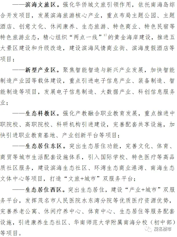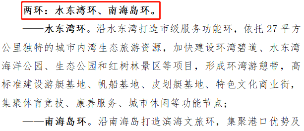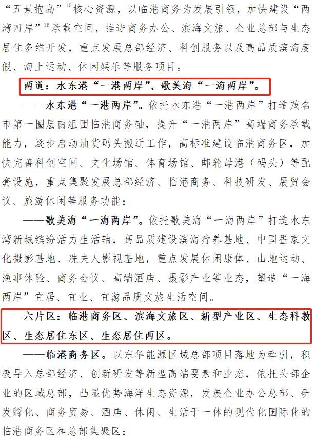 其中“两环”指的是水东湾环、南海岛环;“两道”指的是水东港“一港两岸”、歌美海“一海两岸”;“六片区”指的是临港商务区、滨海文旅区、新型产业区、生态科教区、生态居住东区、生态居住西区。
