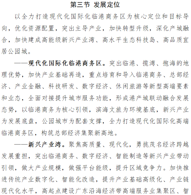 在“十四五”期间,水东湾新城的发展定位为:现代化国际化临港商务区、新兴产业湾、生态科技岛、宜居公园城。其中全力打造现代化国际化临港商务区为核心定位。