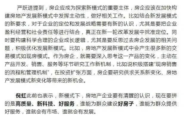 中指研究院认为,长期来看,房地产新模式内涵丰富,从行业角度,预售制度改革、完善住房保障体系、租购并举、盘活存量以及土地制度改革、完善金融财税配套制度等是新发展模式的重要探索方向。从企业发展模式来看,在新形势下,伴随着行业探索新的发展模式,房企也应顺势而为,积极探索适合自身发展的新模式,轻重并举或是重要方向,存量运营重要性提升,代建、物业服务、商业运营、长租公寓等方面具备发展空间。