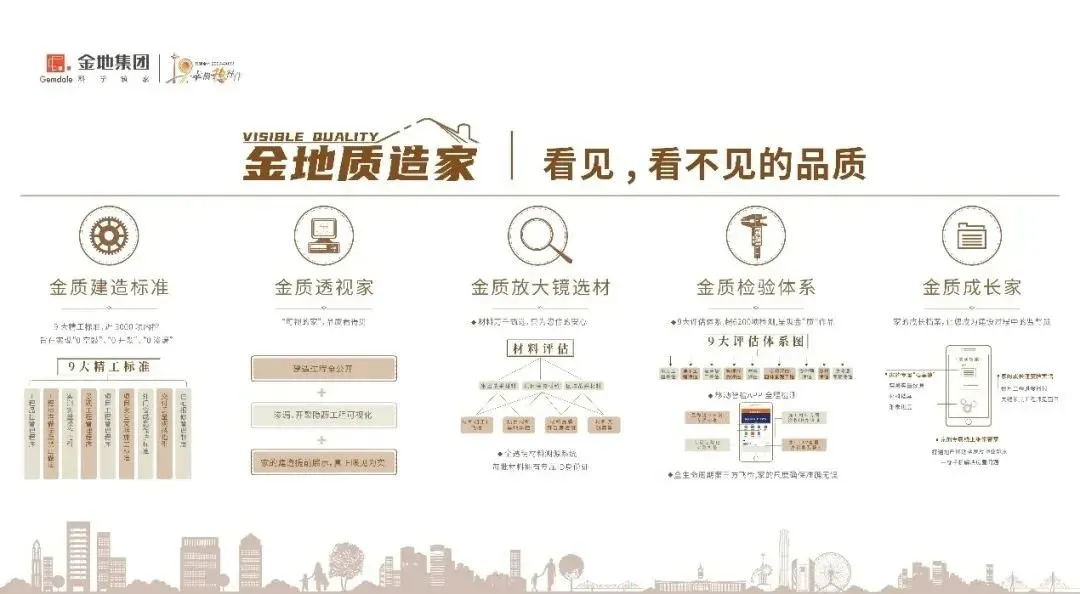 质量品质把控关系到客户满意度,也是各房企关注重点。金地工程管理以工程、设计、成本、客服等组成的大生产体系为根基,通过定标准、强协同、抓落地、促闭环形成金地集团的质量螺旋式提升管理机制,从源头上提升工程质量。在落地执行层面,从建造标准、隐蔽工程透明展示、材料选材、严苛检测体系、过程实时鉴证家的成长五大方面打造“金地质造家”品质体系,打造让业主更放心、更安心的好房子。