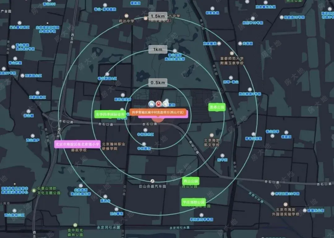 五、四季青地区城中村改造项目(西山片区):地块位于四季青镇中西部,临近西五环,周边配有北京凯文学校、青苗国际双语学校等教育资源。