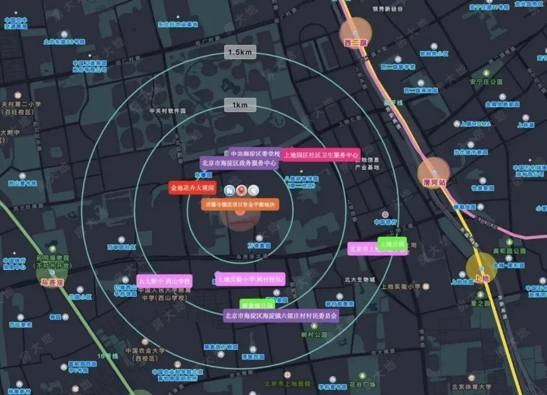 四、功德寺棚改项目资金平衡地块:新地块的位置在马连洼北路跟东北旺中路交汇处,地块南侧有上地实验树村校区,北边900米就是13B号线软件园站,西边1.7公里就是16号线马连洼站。