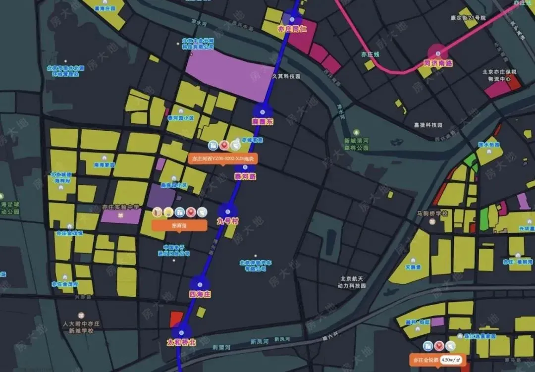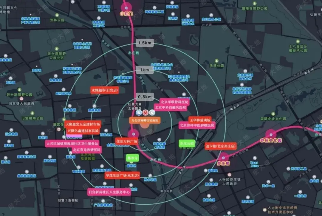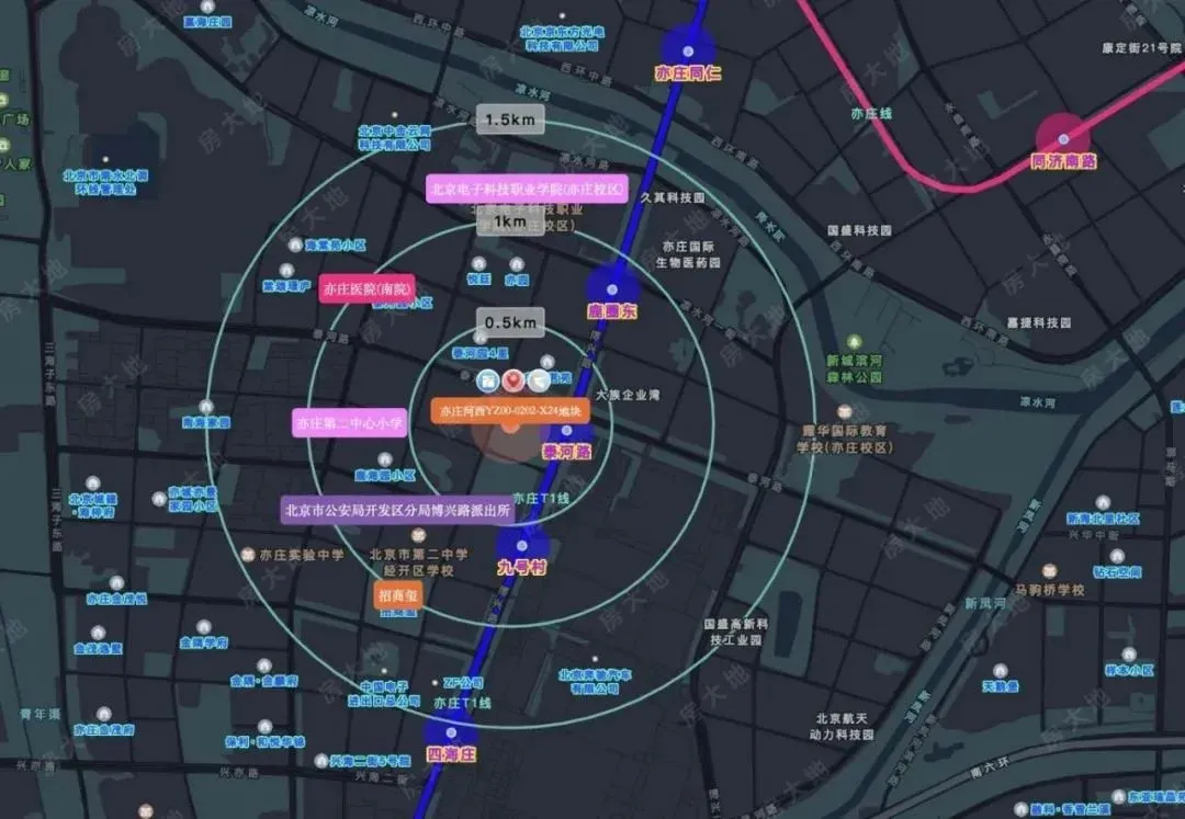 南侧就是北京二中经开区学校,西南侧有龙湖北京亦庄天街,附近还有人大附中亦庄新城学校和十一学校。亦庄河西是亦庄开发区的居住板块,近几年供应了很多住宅用地。比如去年刚刚上市的招商玺,以及此前入市的中海京叁号院等,还有限竞房时代的和悦华锦、金隅学府等以及再早些年的亦庄金茂府等。