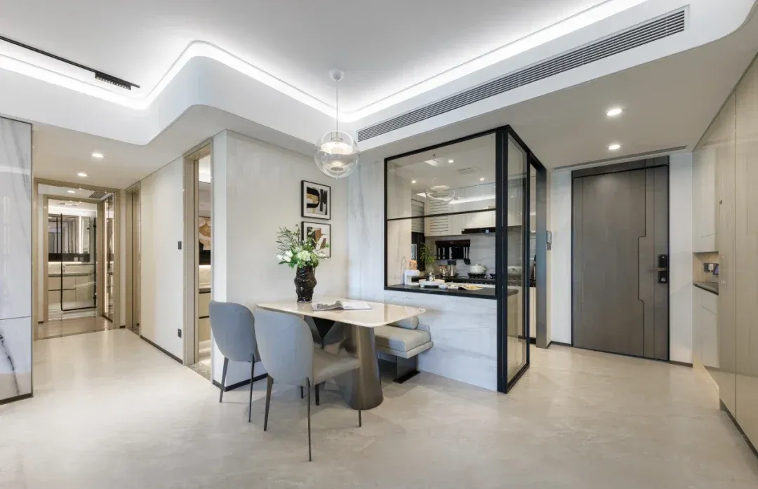 厨房利用移门和岛台设计,既和餐客厅划分明显界限,又营造一个尺度感超强的公区空间。