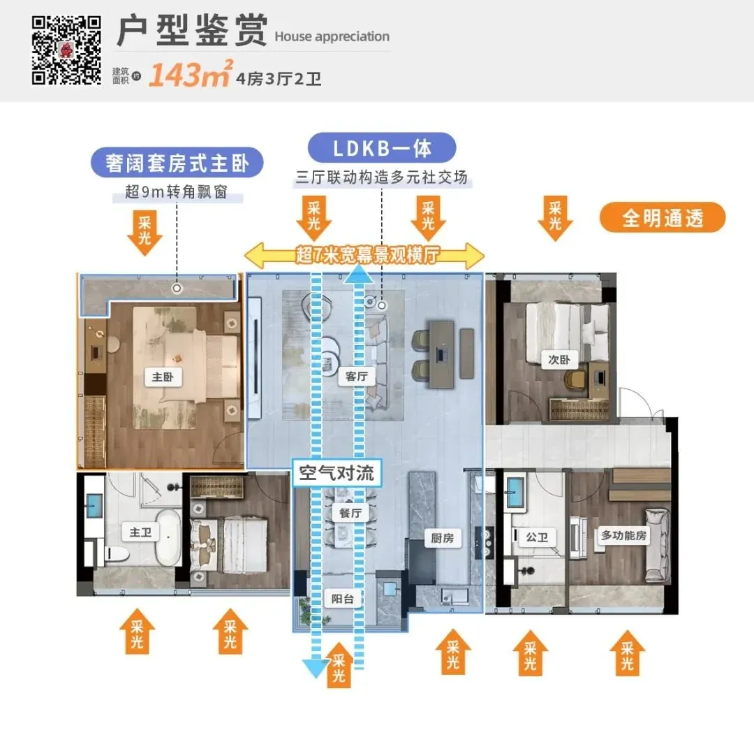 建面约143㎡4房3厅2卫户型,则是尺度感十足的新标杆。25.8米超级海景面,远眺山海、近享森意,山海融入人生。