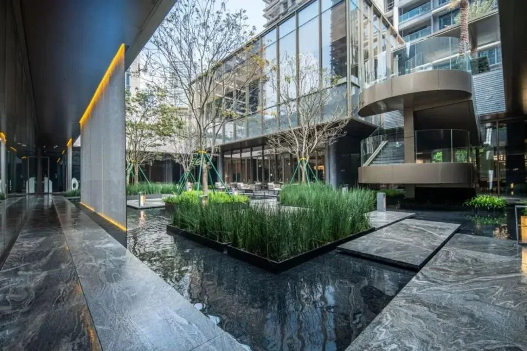 下沉式庭院打造叠级水景,水景幕墙引水入园,搭配四季常开的植物,形成立体花园,让庭院更灵动,度假氛围拉满。