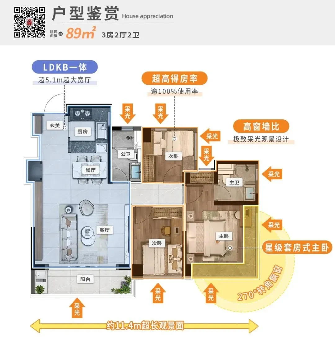 建面约89㎡3房2厅2卫户型,在其它项目大多只能做双面采光的设计时,能通过270°阳台、L型大飘窗的设计,实现极致采光,让家中拥有充足的视野与光照。