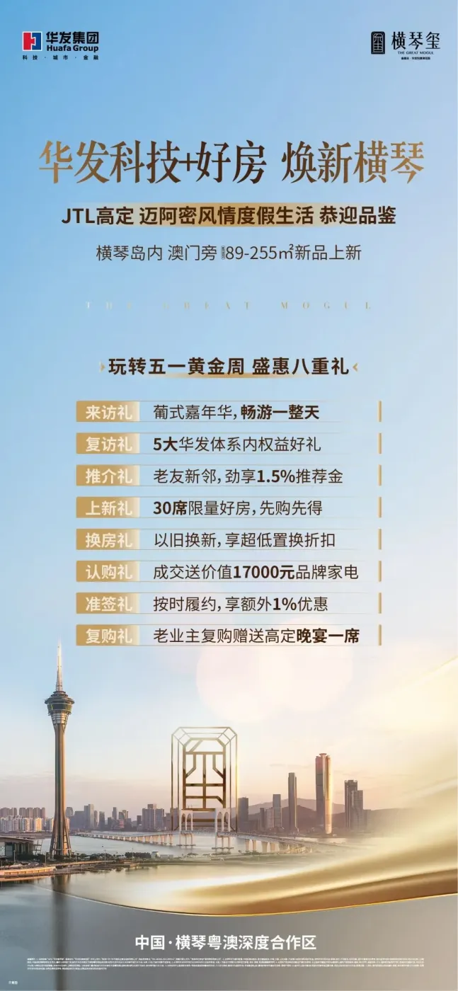据悉,华发横琴玺全新示范区将在“五一”假期盛大开放,建面约89-255㎡揽澳山海华宅上新。