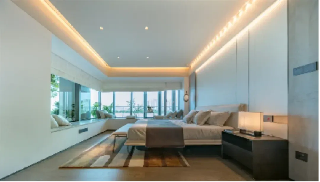 主卧摒弃了传统的墙体设计,直接做了满墙的270°转角景观大飘窗。