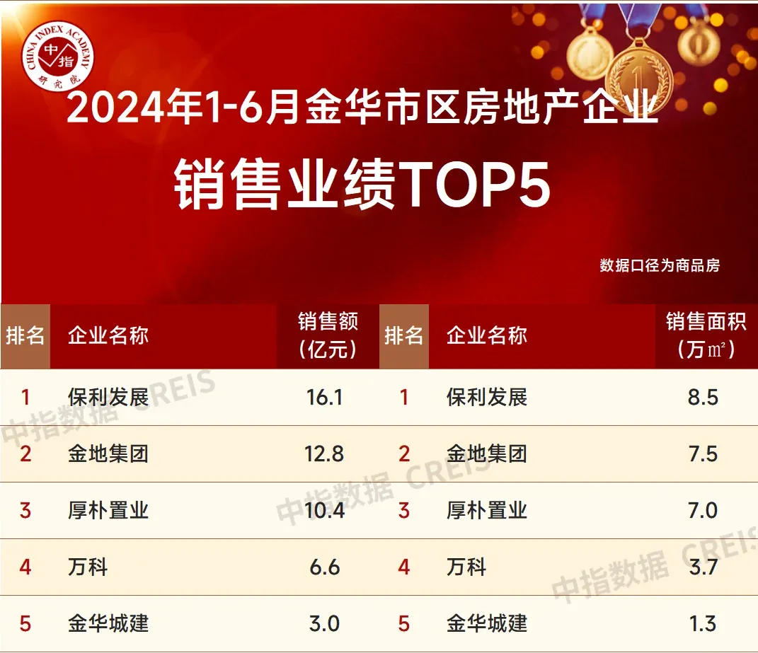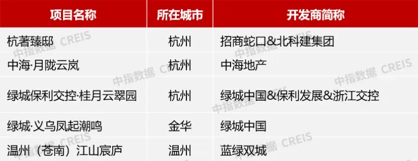 其中,保利发展由去年的第13位晋升至2024年上半年的第5位,在浙江市场销售额达到128.5亿元,同比增长25.5%,是榜单中的少有的金额同比提高的企业之一。在浙江市场,保利发展的业绩贡献主要集中在杭州、宁波、金华、温州等城市,在各城市榜单中均有体现,尤其是在温州和金华市区的销售额均为榜首,宁波市场位列前三。
