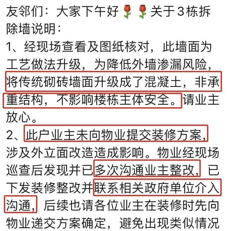 但很快物业就做出了回应称,该业主砸的不是承重墙,不影响楼栋主体安全。