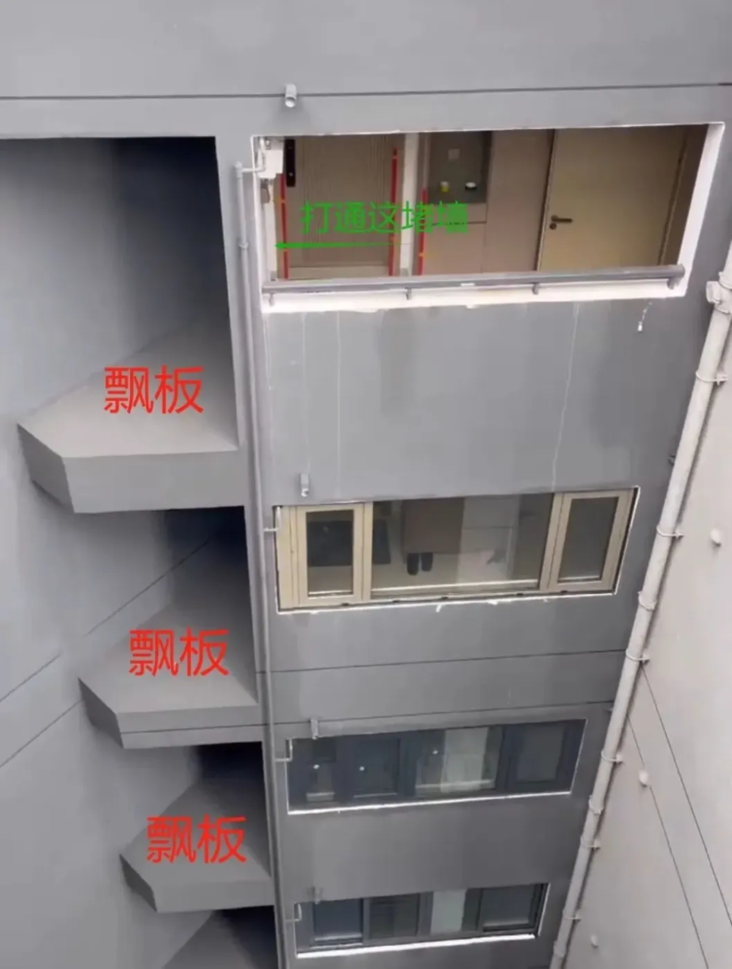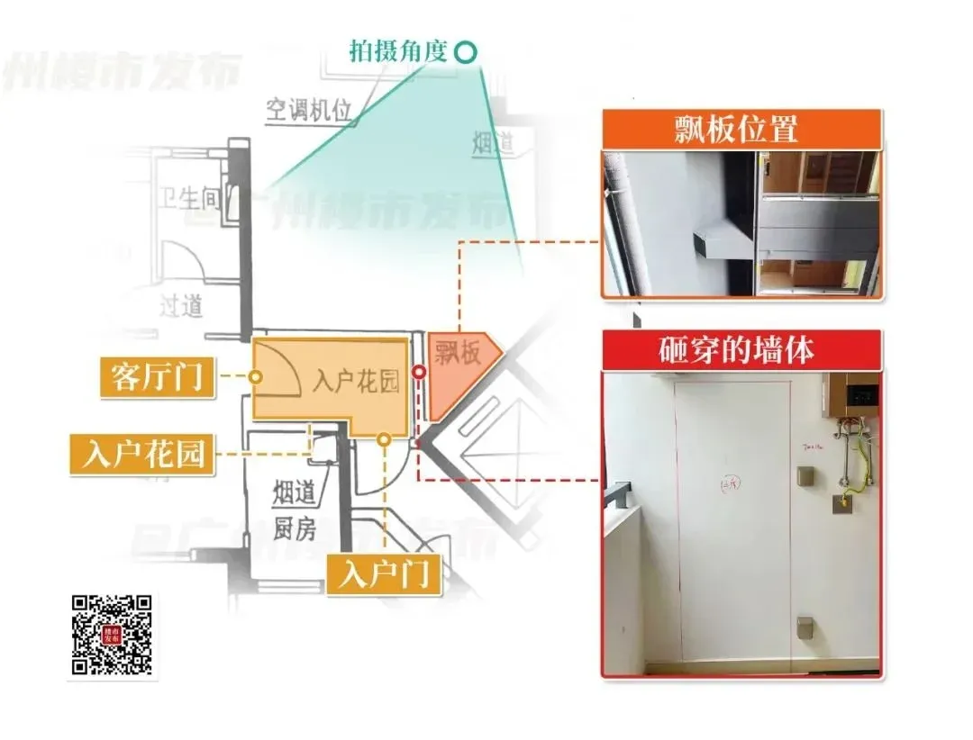 视频显示,业主所在单元的入户花园和外面的飘板只隔了一道墙。砸墙的目的,是想把飘板围进来就变成自家的。
