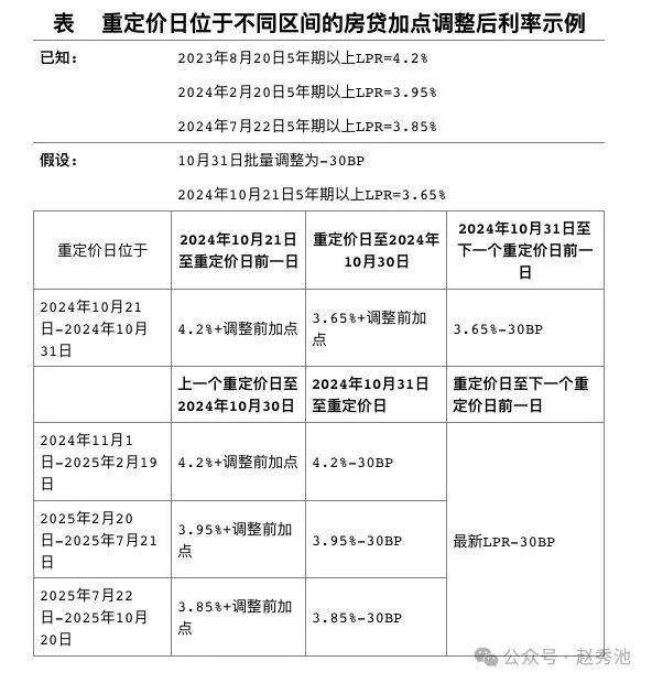 以下表为例,假设2024年10月31日进行批量调整,由于2024年2月、7月5年期以上LPR还分别下降了0.25个百分点和0.1个百分点,因此,对于重定价日为每年1月1日的,10月31日调整后的利率为3.9%(当时的LPR4.2%-0.3%),若LPR保持3.85%不变,则明年1月1日LPR重定价后,利率为3.55%(当时的LPR3.85%-0.3%)。