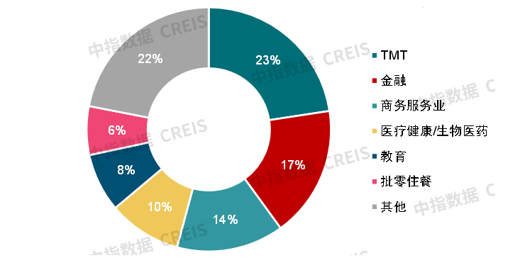 根据中指数据,2024年三季度,一线城市甲级写字楼空置率相对较低,其中广州最低,为10.8%;二线代表城市中,杭州、苏州甲级写字楼空置率分别为11.8%、15.8%,市场供求相对平衡,重庆、天津、青岛、武汉、长沙等城市甲级写字楼空置率相对较高,空置压力相对较大。从空置率变化来看,2024年三季度,重点城市写字楼租赁需求整体延续释放态势,部分城市供求压力短期内略微减轻,甲级写字楼空置率较二季度小幅下降。具体来看,一线城市中,北京、广州、深圳甲级写字楼空置率均有不同程度下降,降幅均在0.4个百分点以内;二线代表城市中,杭州、重庆、天津、青岛、武汉甲级写字楼空置率有所下降,降幅均在0.6个百分点以内。(2)租赁案例:TMT、金融、商务服务业租赁案例占比超五成,监测到多笔大面积交易