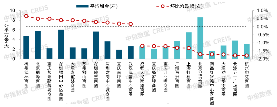 图:2019年二季度-2024年三季度全国重点城市主要商圈写字楼平均租金及环比变化