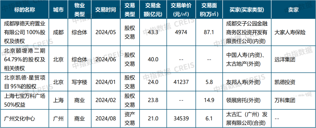 1.本报告所统计的大宗交易标的资产的物业类型包含写字楼、商业、酒店、综合体、工业厂房、产业园区、公寓等,不含地块、住宅。此外,不含交易金额在1亿元以内的交易,不含关联交易等非市场化行为产生的交易。部分资产包类交易,其内含资产分布在不同城市,故在按城市统计交易笔数时存在重复计算。以披露交易金额的交易计算,2024年前三季度15个重点城市大宗交易成交金额约589亿元,一线城市交易金额为453亿元,占比77%,其中上海、北京交易金额在150亿元以上,广深交易金额均在50亿元以内;二线代表城市交易金额为136亿元,成都交易金额最大,约53亿元,苏州、重庆、杭州交易金额在20-30亿元之间。优质商办资产仍受投资人青睐,三季度产生多笔交易,例如:太古汇21亿元收购广州文化中心,印尼金光集团17.2亿元收购上海北外滩星荟中心40%股权,上海汇融东方科技15.1亿元收购上海星光耀广场二期1号楼等。图:2024年前三季度15个重点城市大宗交易宗数占比(按物业类型、买家类型分)
