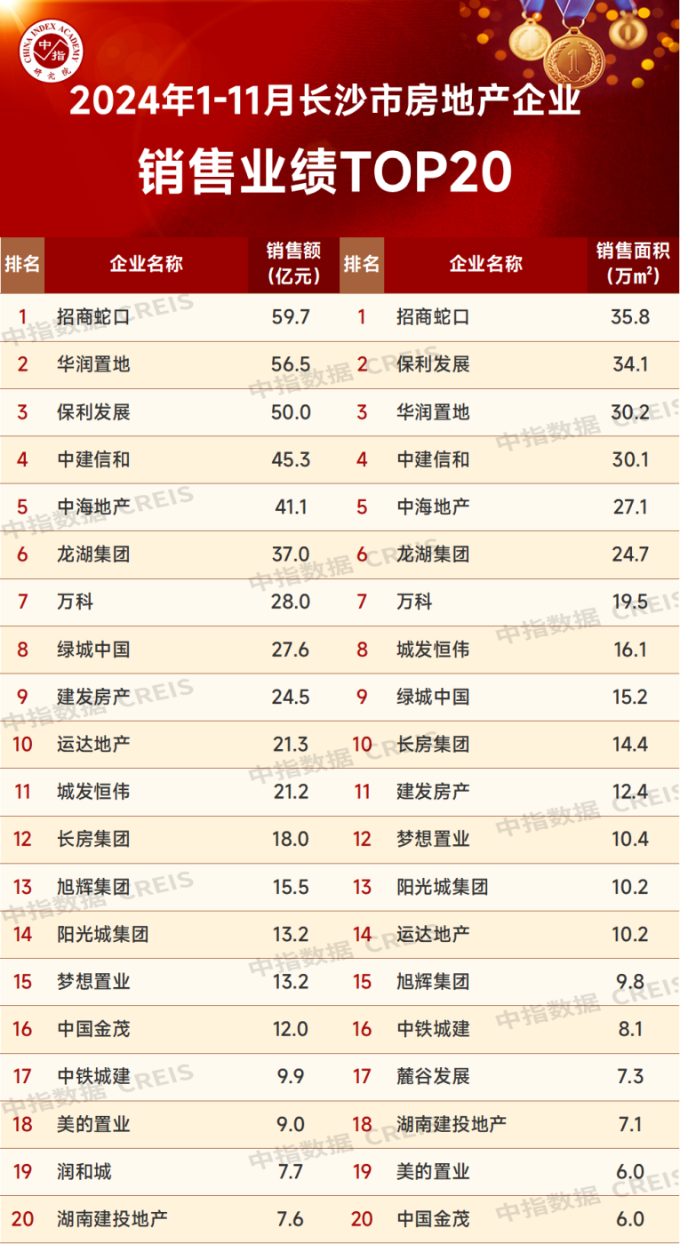 2024年1-11月长沙商品房累计成交面积为502.64万平方米,累计成交金额达755.52亿元,下面请看2024年1-11月长沙房企的具体表现如何。