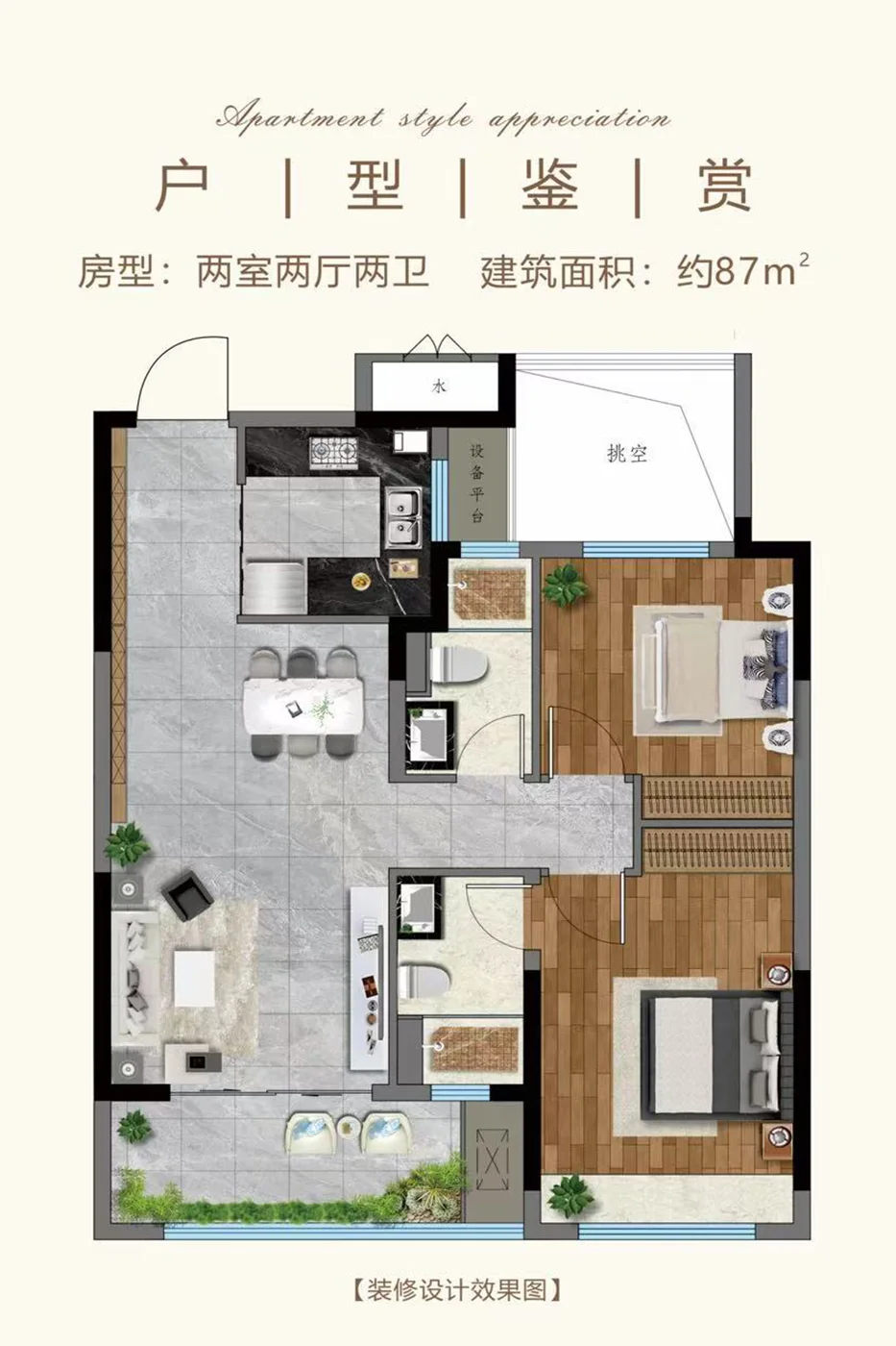 约87㎡两房两厅两卫,客餐厨一体+独立双卧互不干扰,刚需面积也能承载改善级生活品质。